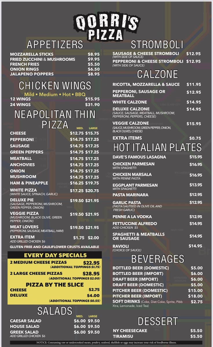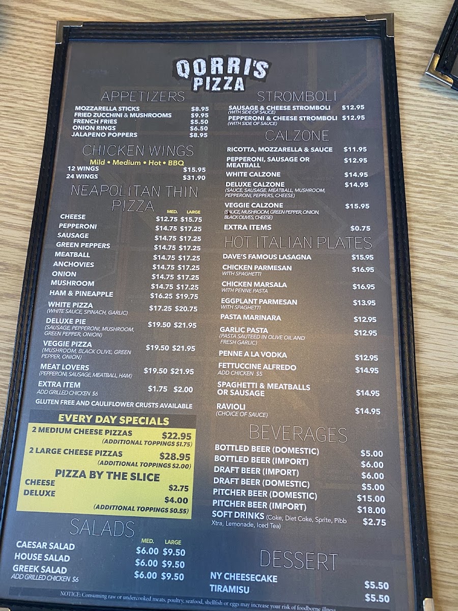 The menu at Qorri's Restaurant offers a straightforward and comforting selection, perfect for casual dining in a relaxed setting. You’ll find classic pizza choices alongside hearty Italian-inspired dishes that invite easy, satisfying meals with family or friends.